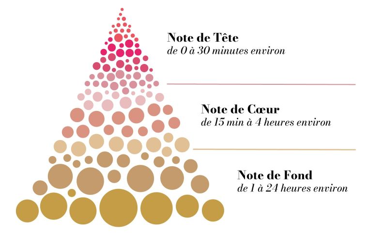La pyramide olfactive définit la structure d’un parfum avec 3 notes. Elle décrit l’évolution des notes olfactives du parfum sur une échelle de temps exprimée en heure.